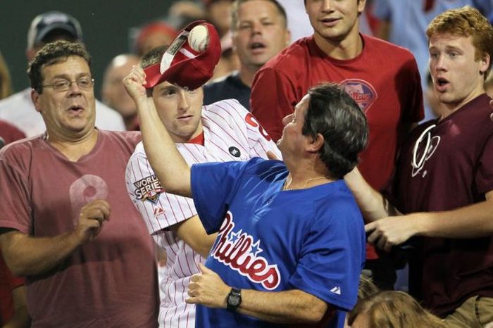 July 31, 2013 – Philadelphia, Pennsylvania, U.S. – A fan catches a sixth-inning foul ball with his cap as the Philadelphia Phillies faced the San Francisco Giants at Citizens Bank Park. (Credit Image: © Yong Kim/MCT/ZUMAPRESS.com)